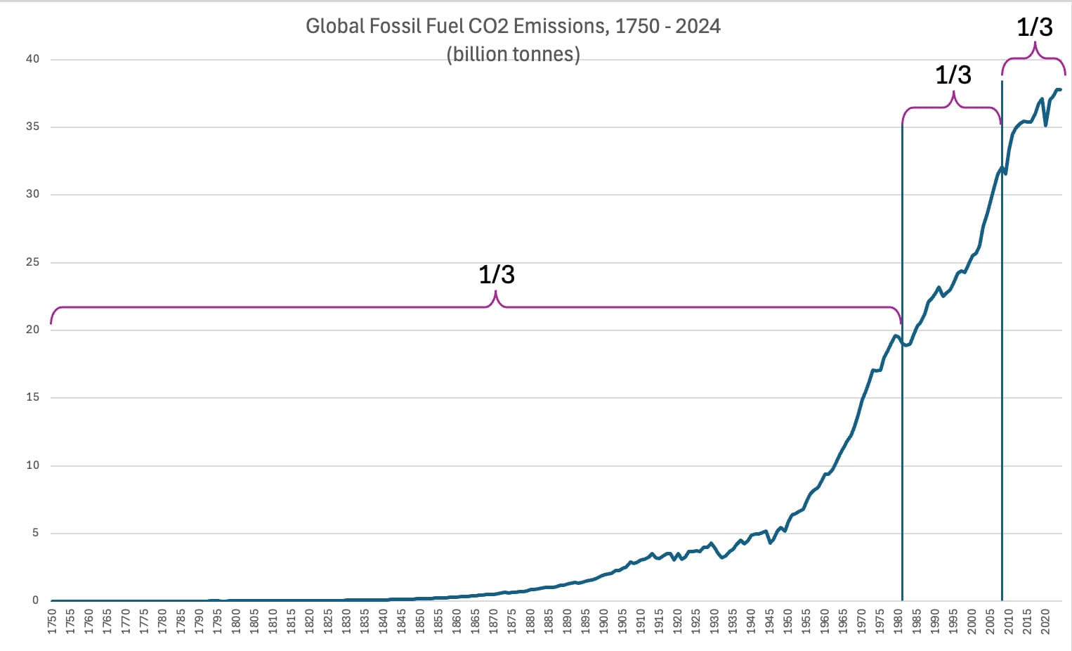 - After two centuries of industrialisation, sixty-seven percent of all CO2 emissions were puked out by the industrial machine since 1980. Half of that since the 2008/2009 Global Financial Crisis. Emissions growth is exponential, most made in the post-Kyoto world with annual records still being broken. The very children raised to be 'environmentally aware' are from the generation that has witnessed the biggest increase in emissions. Civilisation is addicted to fossil fuels.