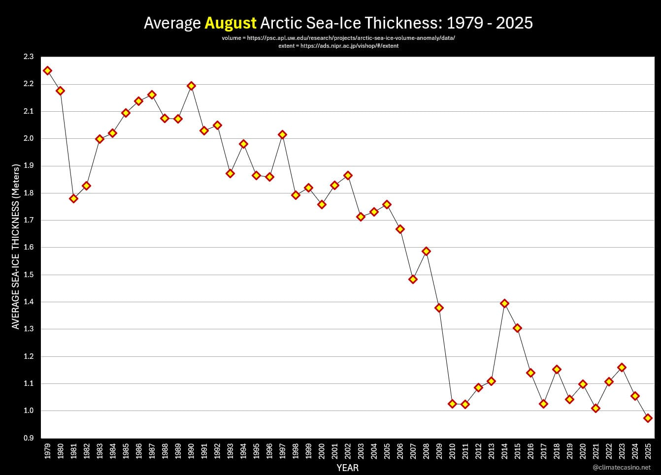 - Shorter, warmer Arctic winters make it more difficult for sea ice to thicken, accelerating the probability of a blue ocean event and amplified feedback loops. Without the polar regions reflecting light away from the planet, every single one of the charts in this post will look much worse. It's coming.