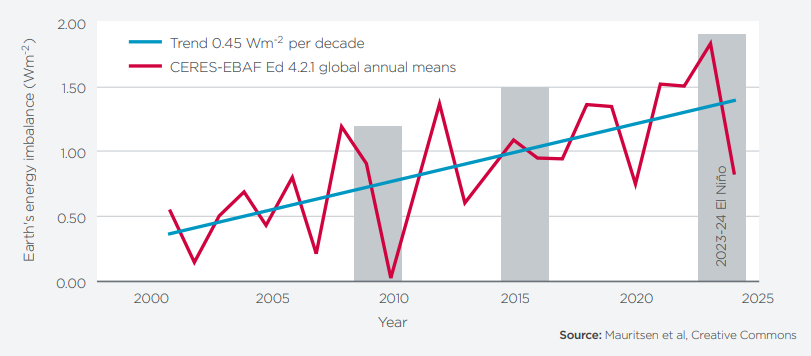 The Earth's Energy Imbalance (EEI) has doubled in recent decades. In early 2023, the rate of solar energy absorption was equivalent to every person alive on Earth continuously boiling 60 kettles. Since 1971, the Earth has accumulated 500 times more energy than the world’s total primary energy consumption in 2024. 93% of this heat is currently being stored in the oceans, a thermal debt that will eventually be paid.