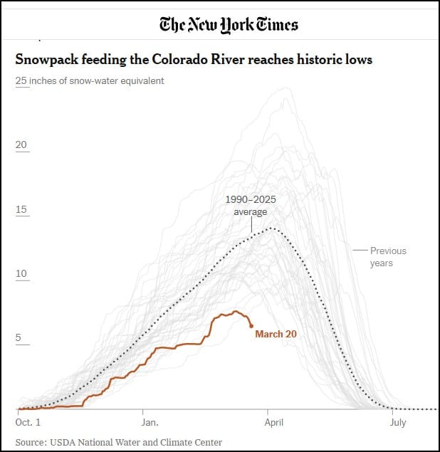 The American Southwest has entered a state of terminal hydrological collapse. The mountain snowpack that sustains the region has failed pushing American agriculture toward a potential disaster in 2026.