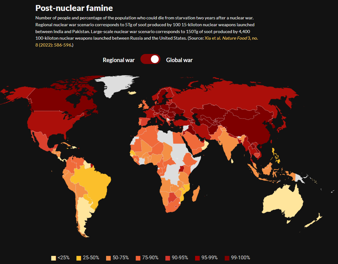 Only the fortunate would die in the blasts. The following chart estimates the proportion of each country's population that would starve to death.