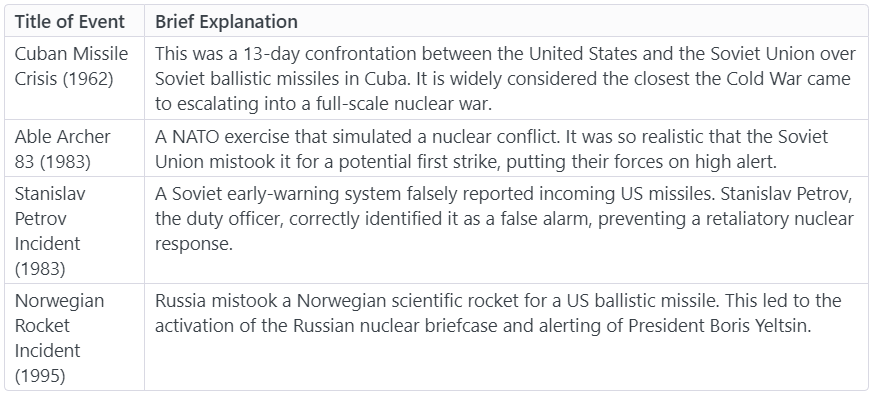 There have been several instances in history where the world has come perilously close to nuclear Armageddon due to accidents, miscommunications, and political crises. Here are some notable examples: